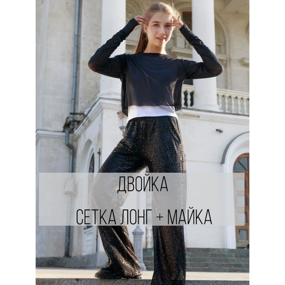Комплект состоит из двух вещей: укороченного лонгслива с удлиненным рукавом , выполненного из высококачественной сетки (100% полиэстер) и хлопковой майки, которая надевается под низ. Обратите внимание, низ сетки не обработан.