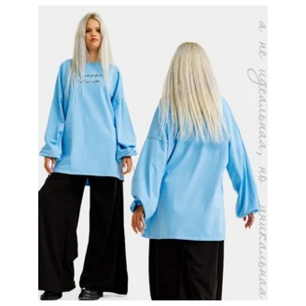 Лонгслив «Я не идеальная, но уникальная» Этот стильный лонгслив станет отличным выбором для тех, кто ценит комфорт и индивидуальность. Выполнен из качественного футера 3-х ниточного без начеса, что делает его мягким, приятным к телу и долговечным. Материал отлично подходит для прохладной погоды, обеспечивая тепло и комфорт. Особенности: Дизайн: На передней части лонгслива размещена вдохновляющая надпись «Я не идеальная, но уникальная», которая подчеркнет вашу индивидуальность и уверенность в себе. Размеры: Лонгслив доступен в размерах от 122 до 172 см, что позволяет подобрать идеальный вариант для детей и подростков. Крой: Свободный крой обеспечивает комфорт и свободу движений, а объемные рукава на резинке добавляют стильный акцент. Цвет: Нежный голубой оттенок добавляет образу свежести и легкости. Универсальность: Подходит как для повседневной носки, так и для занятий спортом или прогулок. Уход: Рекомендуется стирка при температуре до 30°C, чтобы сохранить форму и цвет изделия. Подарите себе или своим близким стильную и удобную вещь, которая будет радовать каждый день!