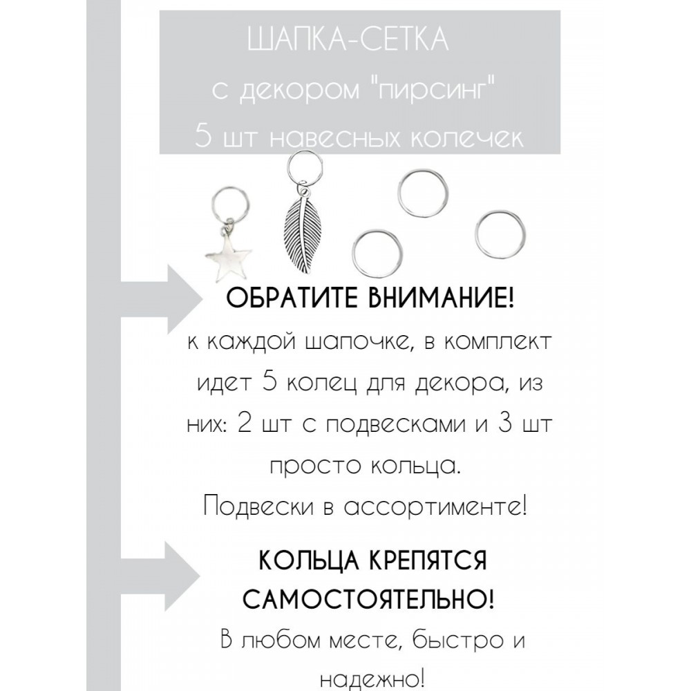 В комплекте Вы увидите 5 колец для самостоятельного закрепления непосредственно на шапочке, путем разжимания и сжатия кольца.