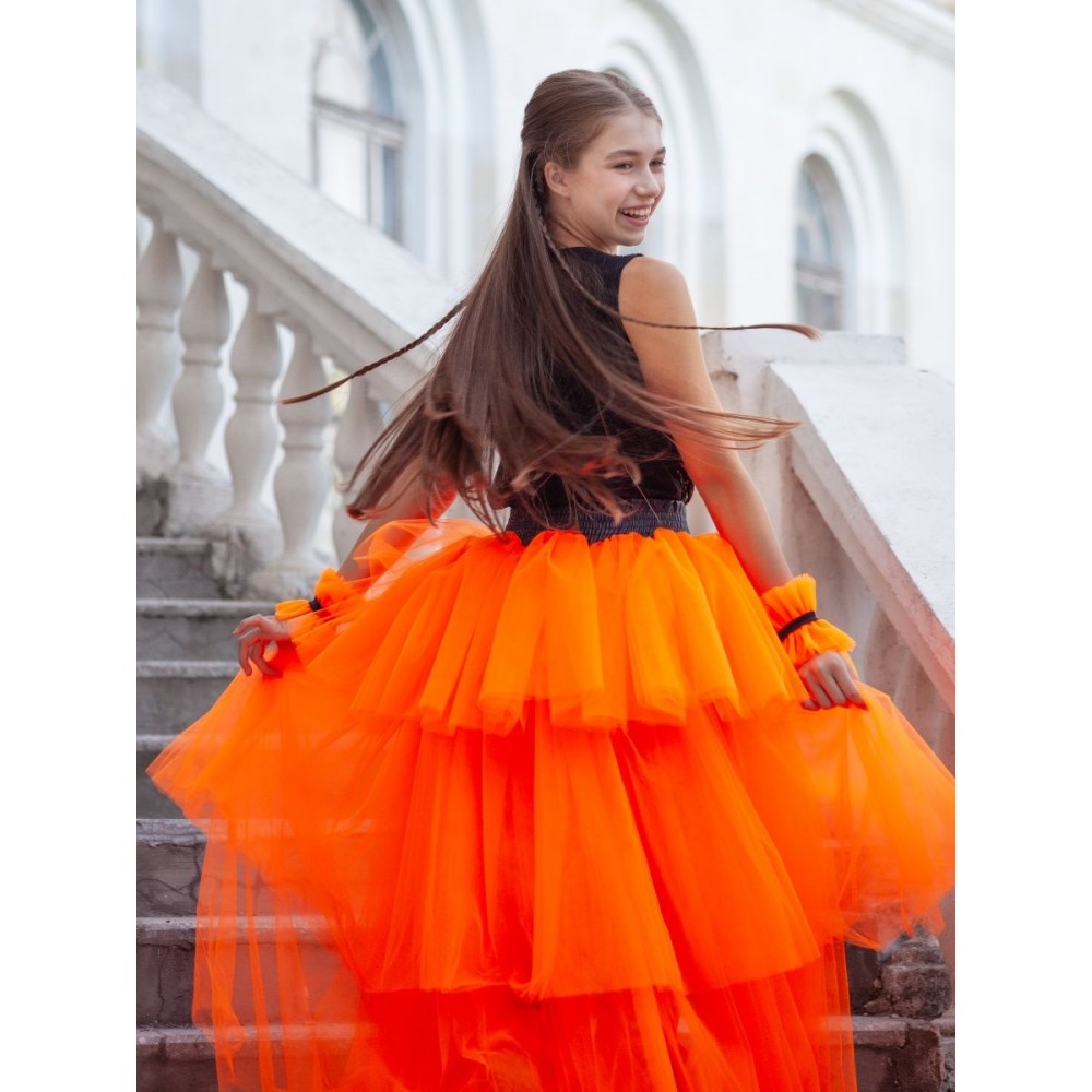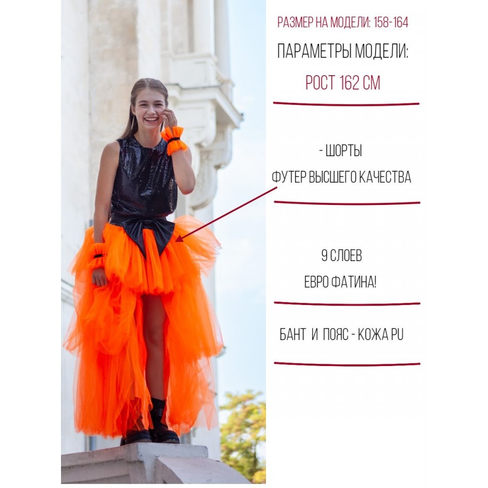 Густая сборка- 9 слоев фатина; юбка асимметричного кроя "mini-maxi"; шорты, заменяющие подклад, не стеснят движений- в них комфортно двигаться и очень удобно танцевать!